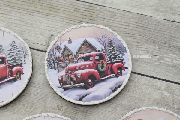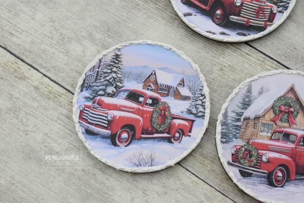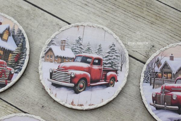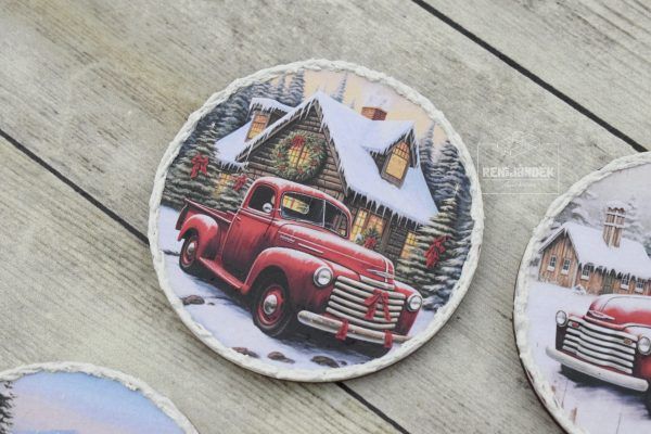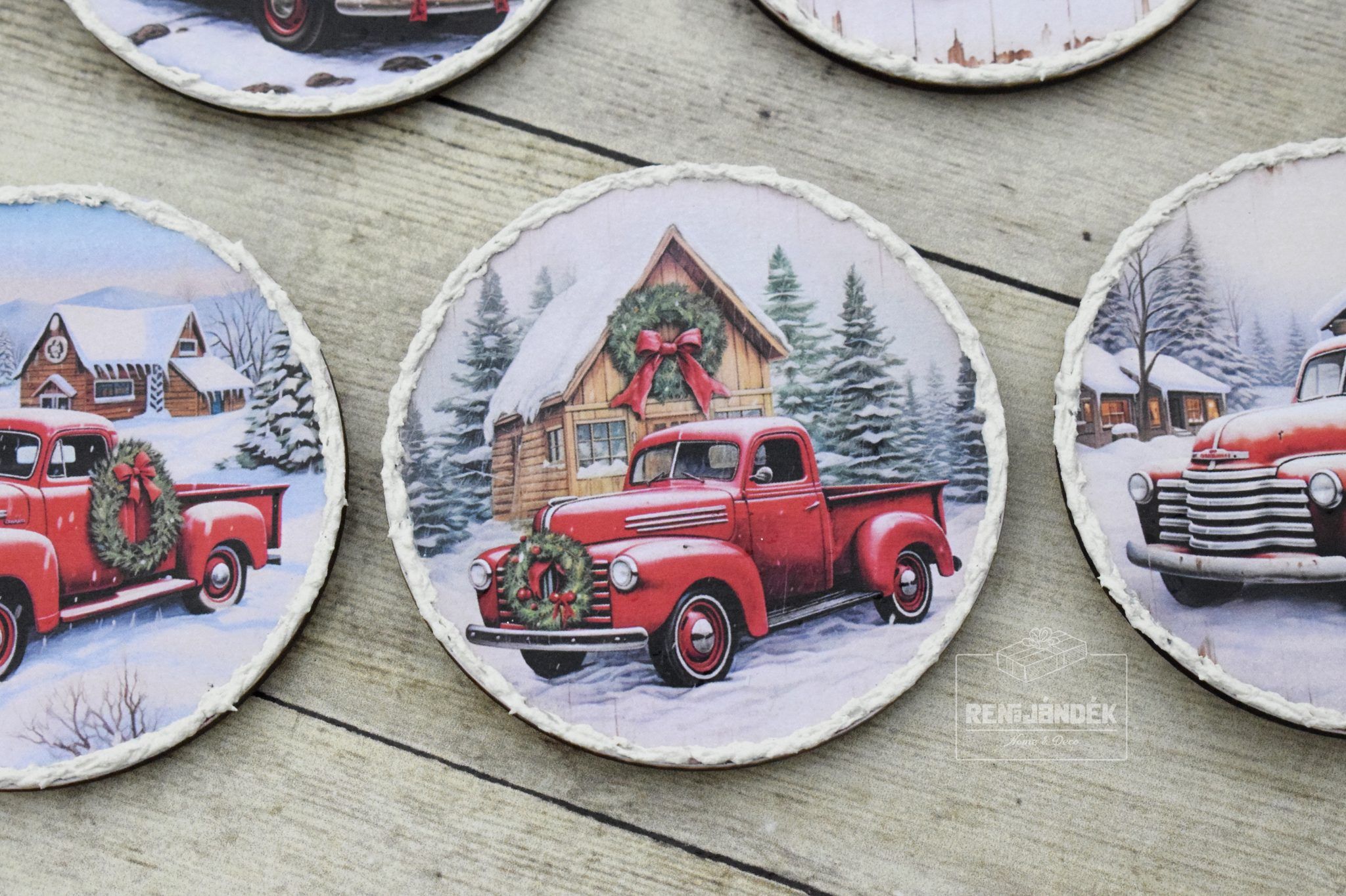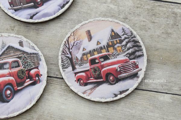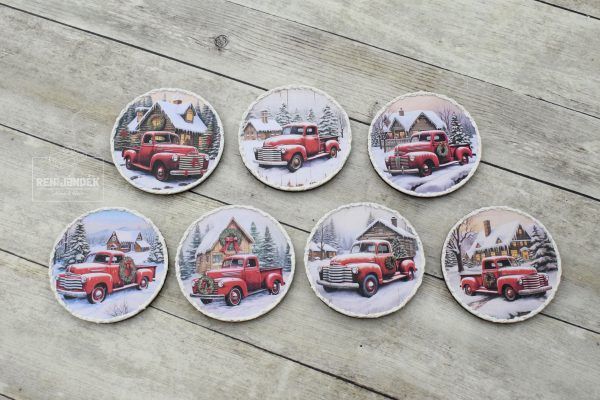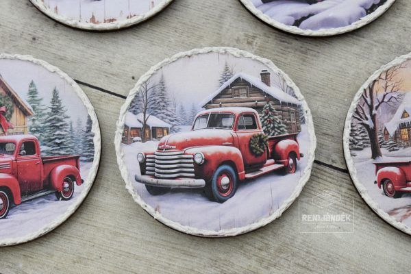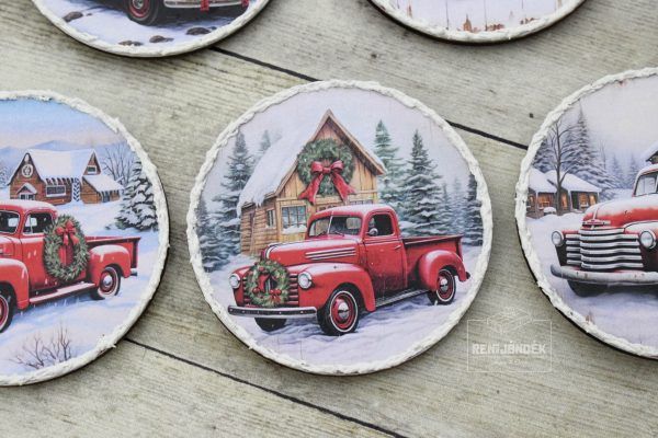 Decoupage technikával (széle hópasztával díszített), fa alapra készített, téli, ünnepi hűtőmágnesek.