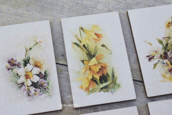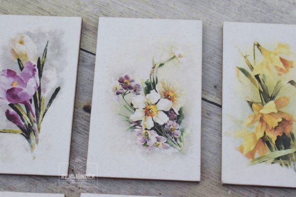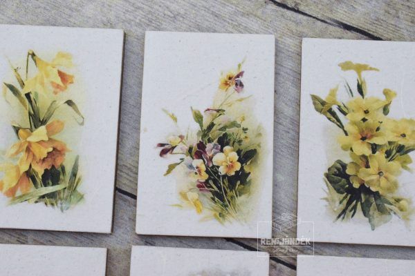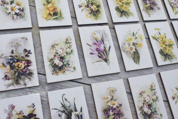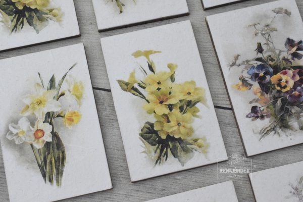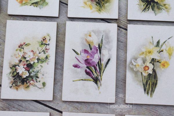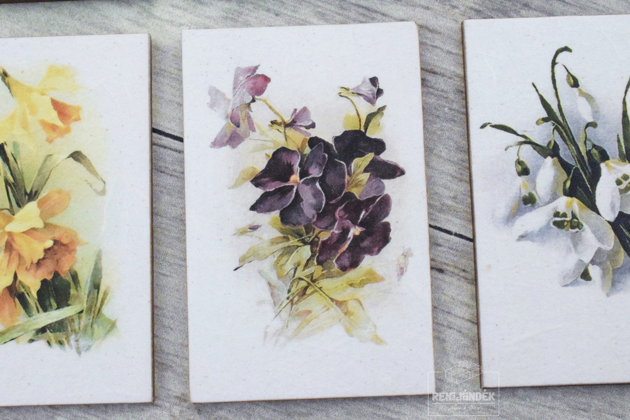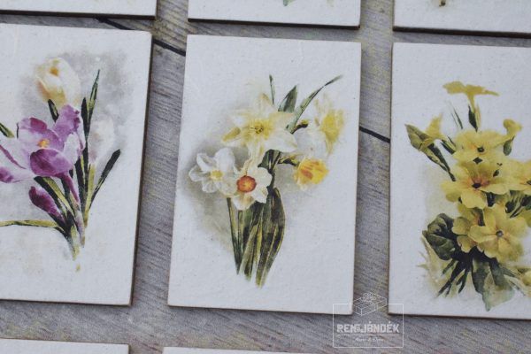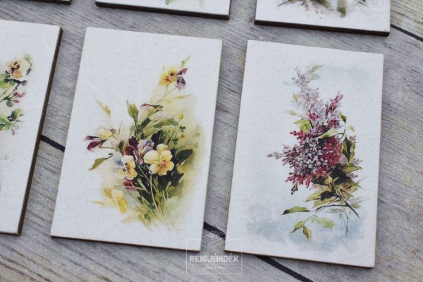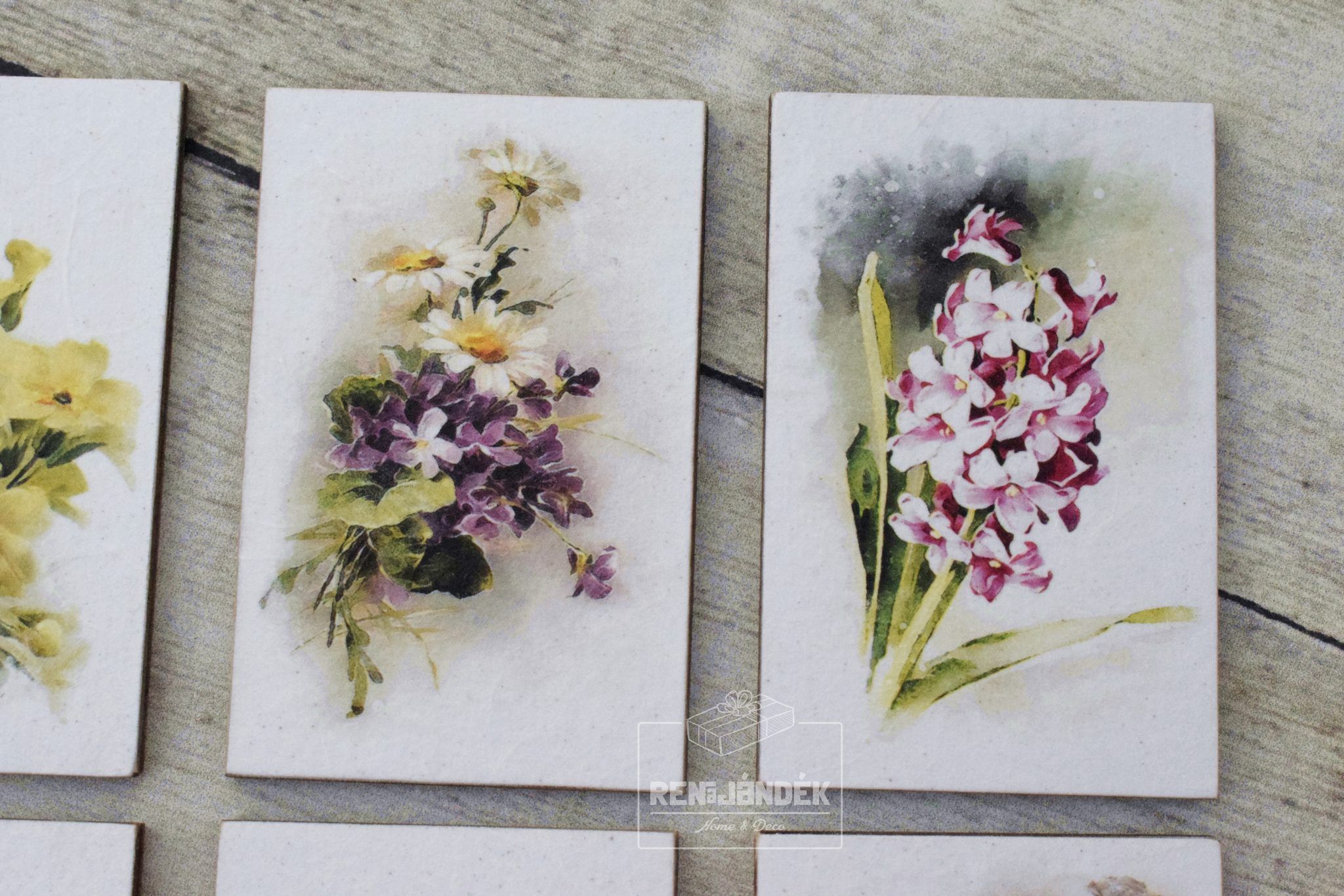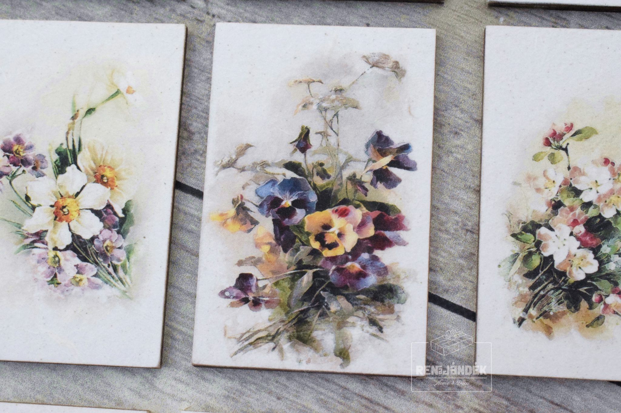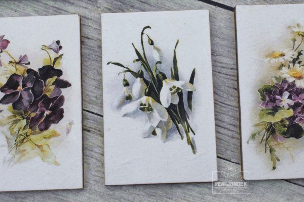 Decoupage technikával, fa alapra készített, tavaszi virágos hűtőmágnesek.