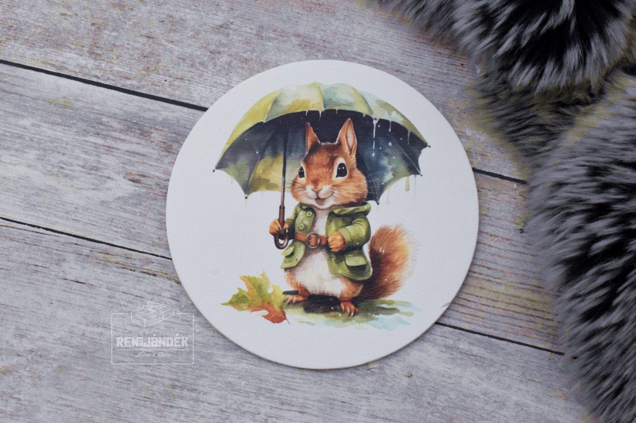 Nyomtatott fa tábla koszorú közép – Mókuska esernyővel